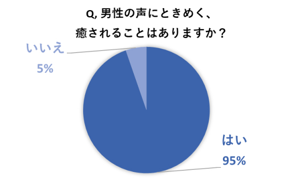 一方、「男性の声にときめく、あるいは癒されることはありますか?」という質問に対しては「はい」と回答した方が9割を超えており、声そのものに癒し効果があることが明らかとなりました。