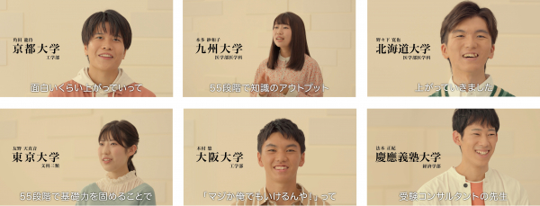 東京大学文科二類に合格した大倉さんは、「55段階はニガテ発見器」と名付け、穴をなくして、受験に必要な学習範囲をすべてカバーできた!と語ってくれました。京都大学工学部に合格した角田くんは、面白いくらい成績が上がって「俺スゲー」と思ってしまったと教えてくれました。