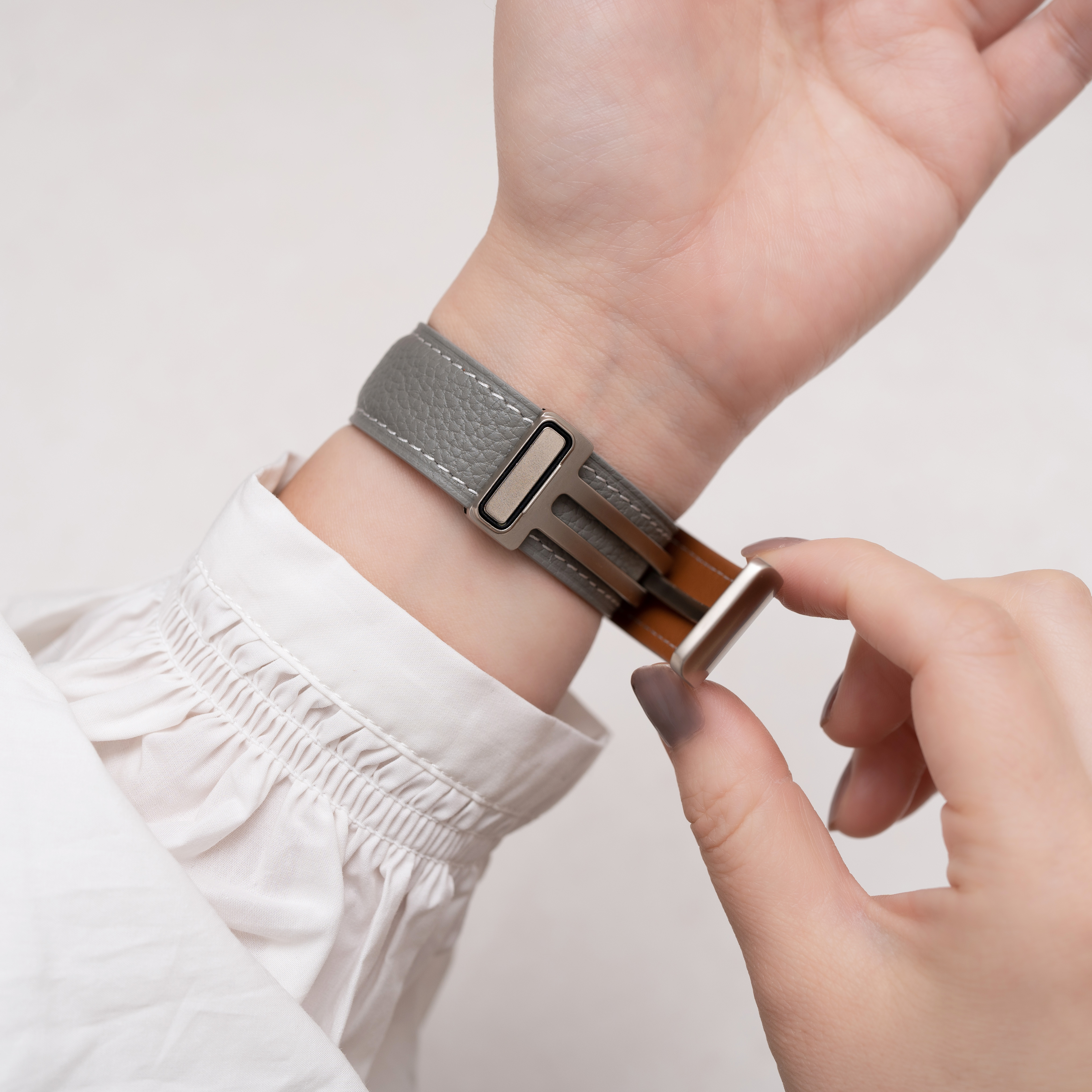 特徴的なマグネット式のDバックルは、長さを微調整できるのでしっかりと手首にフィットし、大変快適な装着感を提供します。