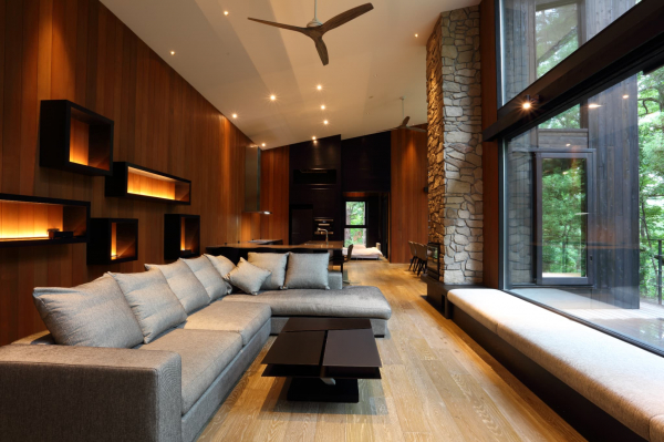 Villa El Cielo hakubaの屋根は単調にならないように片流れ屋根を交差させて変化をつけています。変化をつけたことにより、天井の高さが最大5.2mのリビングやロフトのある寝室といった空間が生まれました。内壁と外壁にはウエスタンレッドシダーを使用しており、空間のアクセントとして大きな石壁を配置しております。森の中の贅沢な邸宅でゆったりした時間をお楽しみ下さい。