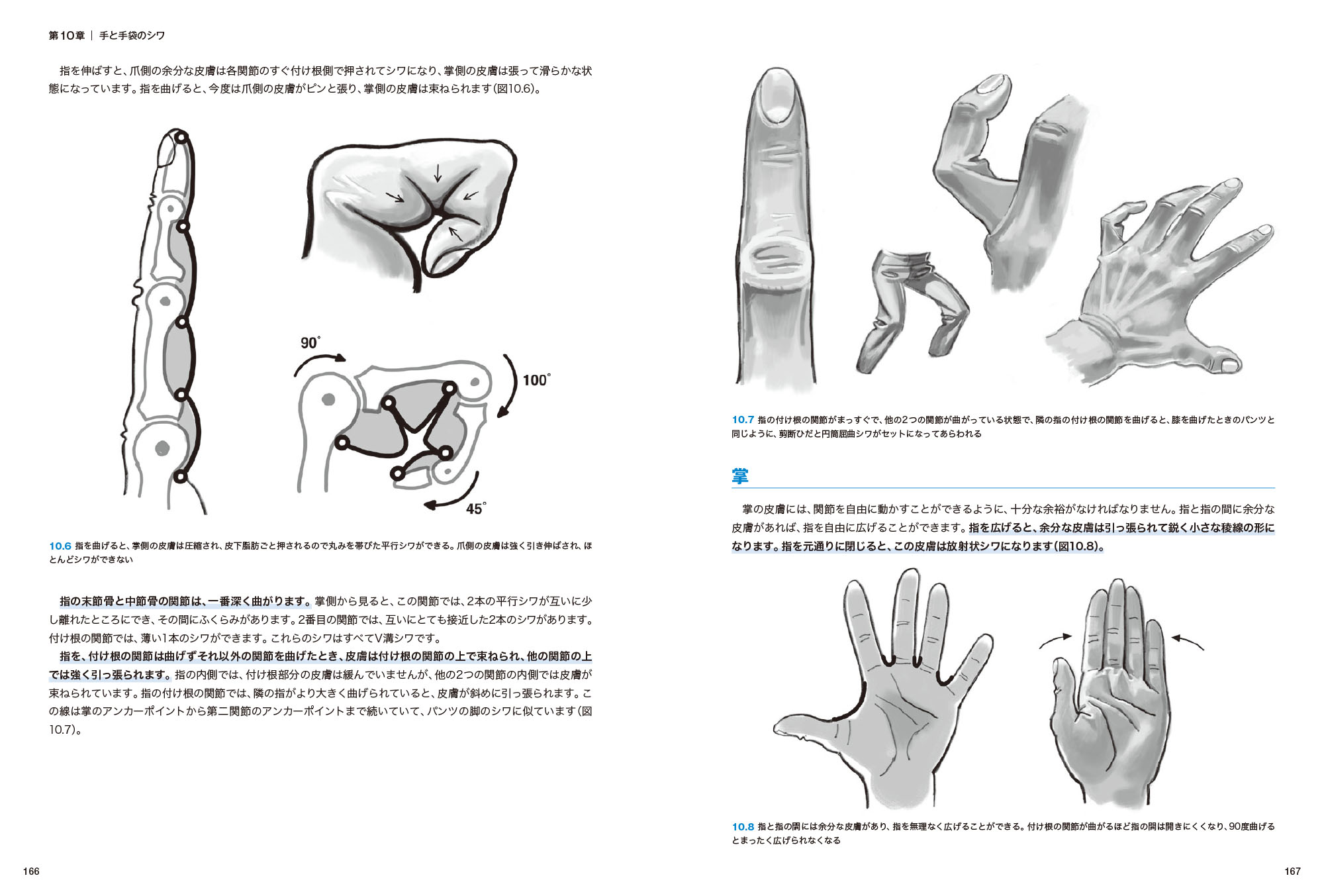 服装のみならず、手を曲げ伸ばししたときにできる皮膚のシワ、怒ったり笑ったりしてできる顔のシワなども描き方を詳しく紹介していきます。
