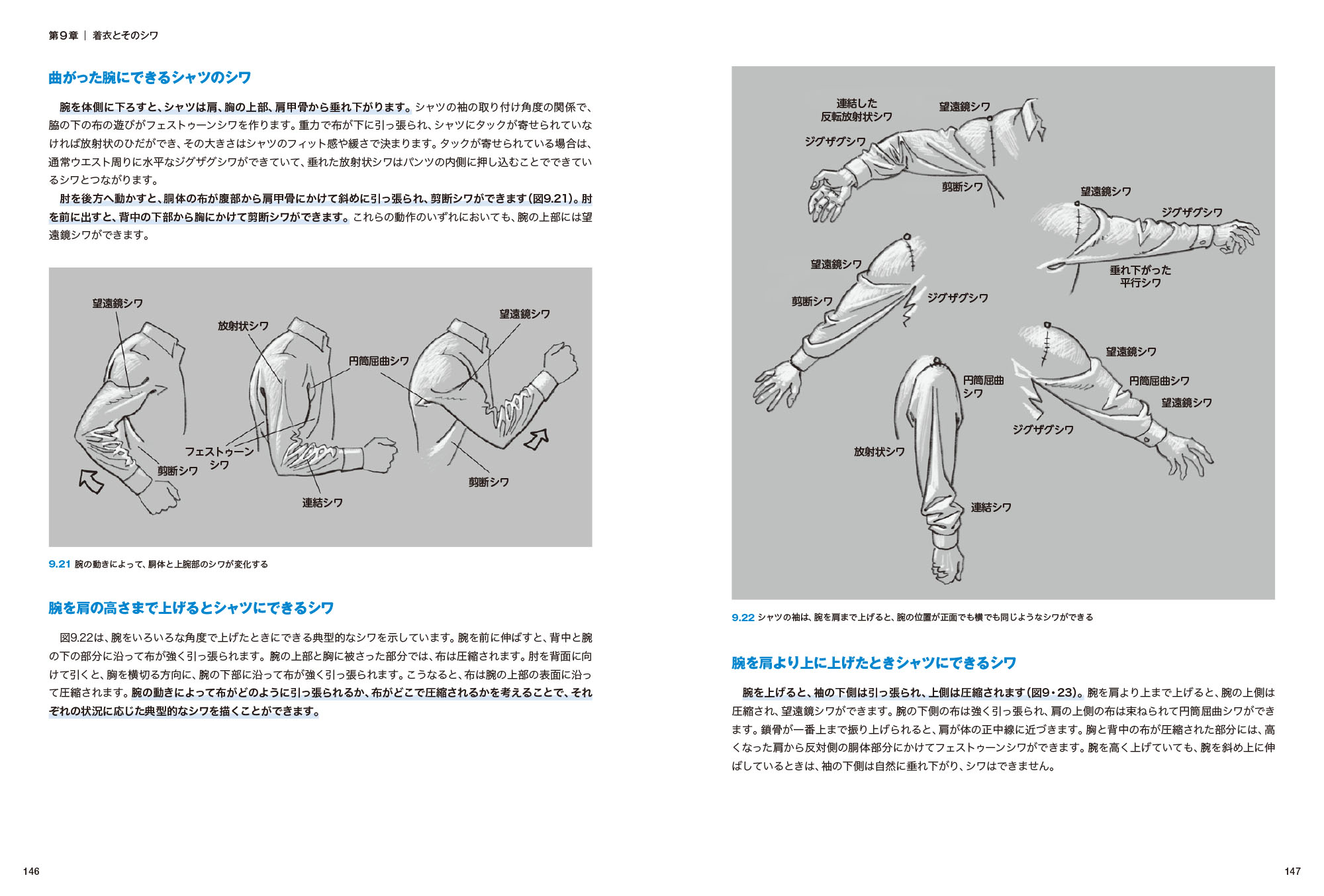 ●シャツやジャケットなど、服装に現れるシワを細かく図解