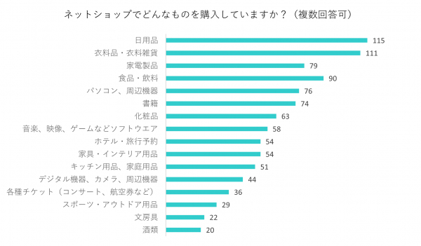 「日用品」115票、「衣料品・衣料雑貨」111票、「家電製品」79票、「食品・飲料」90票、「パソコン、周辺機器」76票、「書籍」74票、「化粧品」63票、「音楽、映像、ゲームなどソフトウエア」58票、「ホテル・旅行予約」「家具・インテリア用品」54票、「キッチン用品、家庭用品」51票、「デジタル機器、カメラ、周辺機器」44票、「各種チケット(コンサート、航空券など)」36票、「スポーツ・アウトドア用品」29票、「文房具」22票、「酒類」20票でした。
