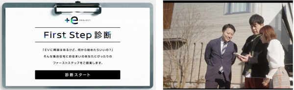 積水ハウスの「シャーメゾンZEH」に到着後、さっそく高橋愛さんが乗ってきた日産リーフに充電を開始。また「+e PROJECT」特設サイト内にある、集合住宅にEVを導入するためにはどうしたら良いのかが簡単にわかる『First Step診断』を体験し、充電サービス事業者などの手順を学びました。