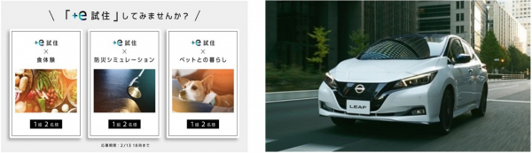 プロジェクトのスタートとして、日産が神奈川県横浜市にある積水ハウスが建築したゼロエネルギーの賃貸住宅「シャーメゾンZEH」にて、集合住宅でEVのある暮らしを体験するイベント「+e試住」を3月4日より実施します。「+e試住」は「食体験」「防災シミュレーション」「ペットとの暮らし」の3つのテーマを設定し、集合住宅にてEVのある暮らしを1泊2日で体験していただけます。