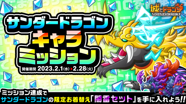 株式会社アソビズム(本社:東京都千代田区、代表取締役:大手智之)は、App Store・Google Playにて好評配信中の『城とドラゴン』で、「サンダードラゴンキャラミッション」を2023年2月1日(水)より開催いたします。