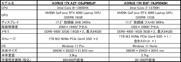 一方、「AORUS 17H BXF-74JP554SH」は、CPUに14コア/20スレッドのIntel Core i7-13700H(ベースクロック2.4GHz、Turbo Boost時最大5GHz)、GPUにNVIDIA GeForce RTX 4080 Laptop GPU GDDR 12GB(最大ブーストクロック2010MHz、最大消費電力150W)、ディスプレイにリフレッシュレート360Hz駆動の17.3型フルHD液晶パネルをそれぞれ採用した製品です。