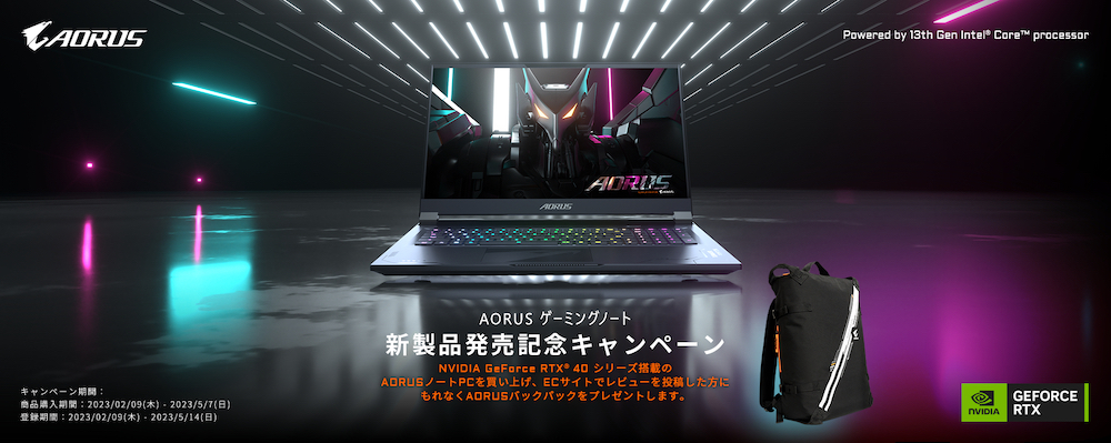 第13世代Intel CoreプロセッサおよびNVIDIA GeForce RTX 40シリーズを搭載したAORUSゲーミングノートPCの発売を記念して、2023年2月9日~5月7日の期間中にRTX 40シリーズ搭載のAORUSノートPCを購入し、Amazon.co.jpや価格.com、ショッピングサイトなどに100文字以上の製品レビューを投稿してくださったユーザーを対象に、AORUSオリジナルバックパックをもれなくプレゼントする新製品発売記念キャンペーンを実施いたします。キャンペーン登録期間は、2023年2月9日~5月14日です。応募方法などの詳細につきましては、下記キャンペーンページをご参照ください。