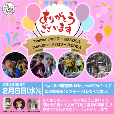 また、ちょい食べ明日香野はフォロワーになっていただいた皆さまに感謝の気持ちを込めまして、「Twitterフォロワー2万人、Instagramフォロワー3千人突破キャンペーン」を1月30日より開始しています。
