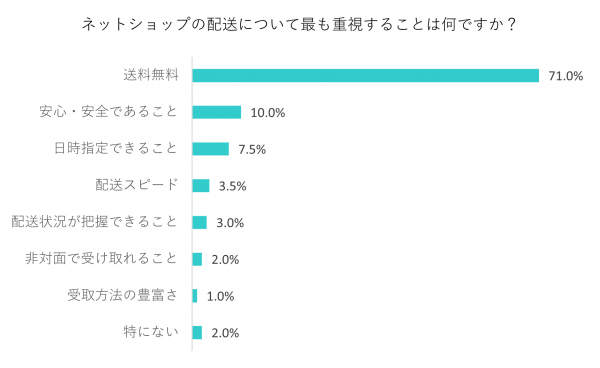 「送料無料」71%、「安心・安全であること」10%、「日時指定できること」7.5%、「配送スピード」3.5%、「配送状況が把握できること」3%、「非対面で受け取れること」2%、「受取方法の豊富さ」1%、「特にない」2%という結果でした。
