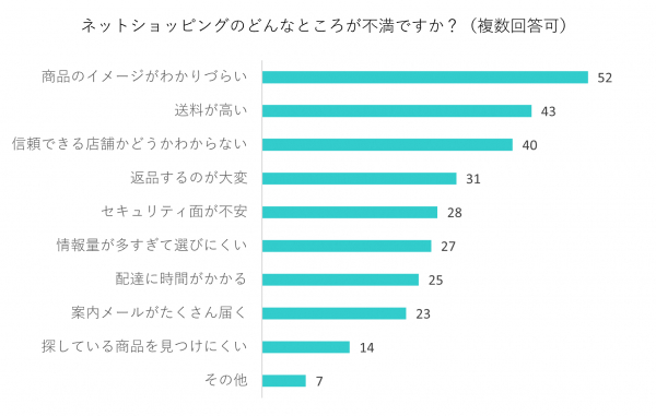「商品のイメージがわかりづらい」52票、「送料が高い」43票、「信頼できる店舗かどうかわからない」40票、「返品するのが大変」31票、「セキュリティ面が不安」28票、「情報量が多すぎて選びにくい」27票、「配達に時間がかかる」25票、「案内メールがたくさん届く」23票、「探している商品を見つけにくい」14票、「その他」7票でした。