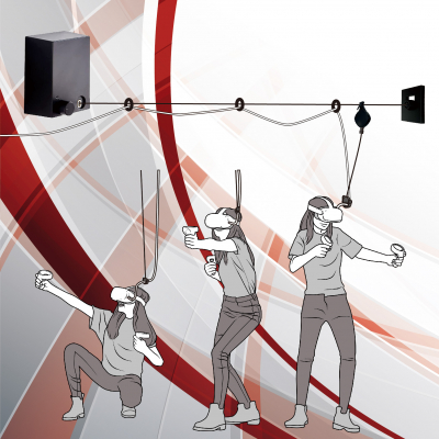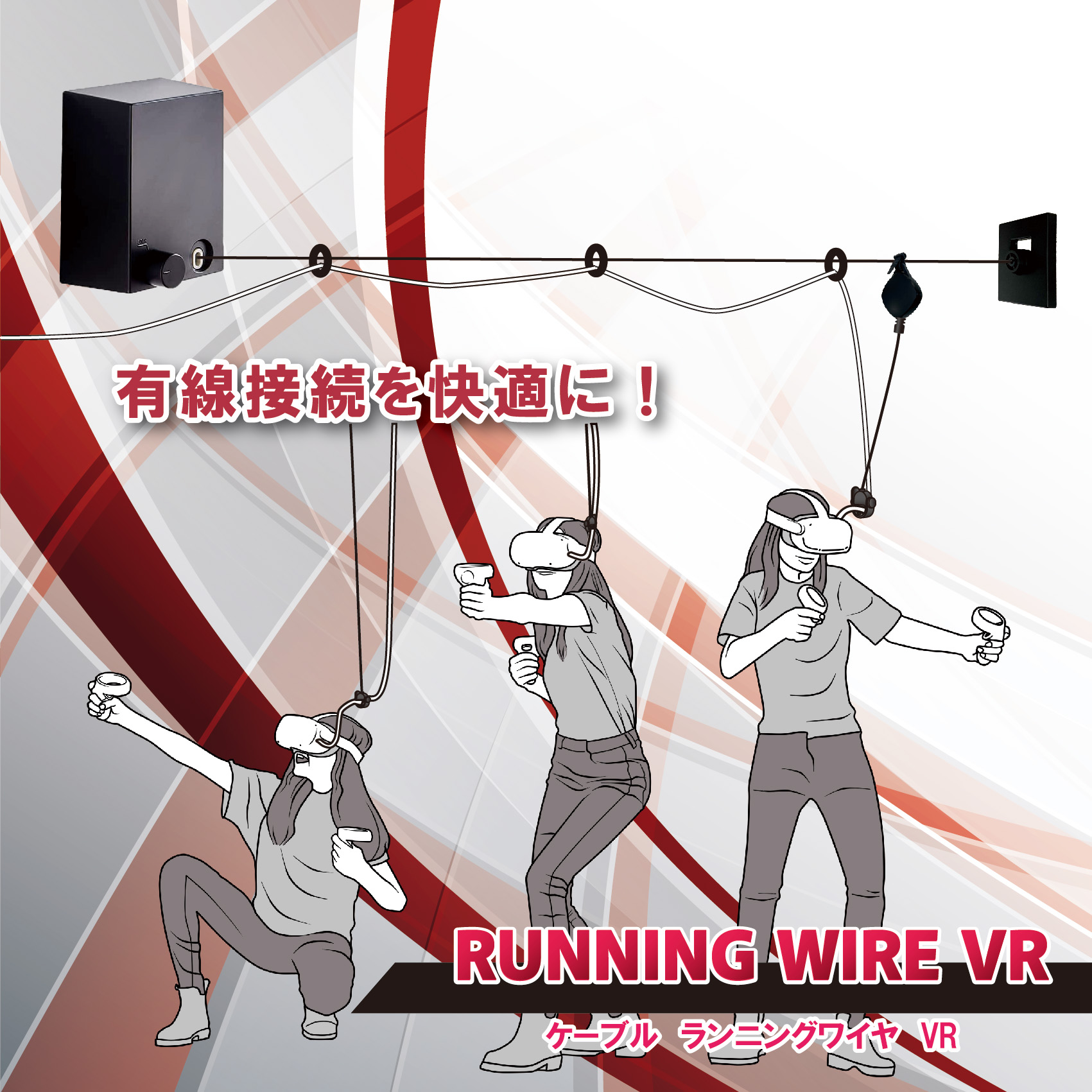 「ケーブル・ランニングワイヤ VR」は直径1.5mmのスチールワイヤをプレーヤーの頭上に通して使用します。最大4.2m(本体厚を含む)の長さで、一般的な8畳間の幅(約3.6m)もラクラク。