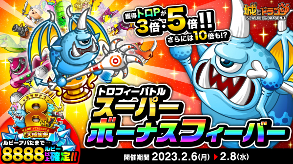 株式会社アソビズム(本社:東京都千代田区、代表取締役:大手智之)は、App Store・Google Playにて好評配信中の『城とドラゴン』で、「トロフィーバトル スーパーボーナスフィーバー」を2023年2月6日(月)より開催いたします。