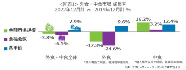 外食・中食市場の2022年12月は、売上3.8%減(2019年同月比)