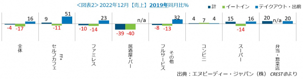 業態別・利用形態別の12月の売上2019年同月比をみると(図表2)、外食・中食全体のイートインは同17.3%減と、前月より1.5ポイント増で、コロナ禍において2022年10月に次いで良い状況でした。