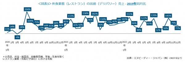 外食業態計(レストラン計)の出前(デリバリー)売上2019年同月比をみると(図表3)、プラス成長が続いています。デリバリー増加のピークは2020年5月の204%増ですが、その後も2ケタ増が続いています。2022年12月は同77%増でした。