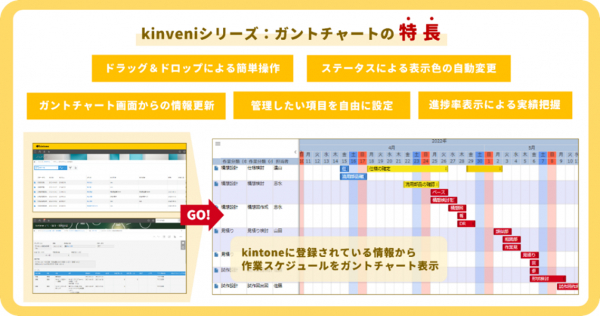 「kinveniシリーズ:ガントチャート」は、kintoneのこうした情報共有機能に、タスクのデータからガントチャート形式のスケジュール表を簡単に作成できる機能を追加したプラグインです。ドラッグアンドドロップによるスケジュール変更、ステータスによる表示色の自動変更、自由な項目設定など、直感的な操作による、情報の見える化を可能にします。操作はkintone上で行うため、難しい知識の習得を必要とせず、導入も容易です。部門や会社の垣根を越えて、チーム全体での情報共有とプロジェクトの進捗状況を可視化し、様々なスケジュールの管理をガントチャート形式で実現します。