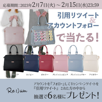 オタク女子専用カフェサロン「Ataraxia cafe(アタラキシアカフェ)」を運営するAirafu株式会社(アイラフ 大阪府浪速区)はオリジナルブランド「Re:)am(リラム)」から、新作バッグ「Obtenir(オプトゥニール)」(全6色)が当たるキャンペーンを公式Twitterにて実施致します。