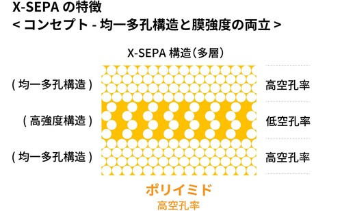 X-SEPAは、耐熱性の高いポリイミドに、三次元規則配列に均一な空孔を形成した膜を多層に重ね合わせた構造を有しており、この独自の構造により、各層の特性を細かく制御しながら、用途や求められる電池性能に応じて全体を最適化することが可能です。これにより、X-SEPAは従来のセパレータの役割を超えて、電池に新たな付加価値を提供することができます。その構造と材料は、長寿命化、高信頼性、ハイレート性能に貢献できるので、安全性の確保や、高温地域での電気自動車やエアモビリティーなどの今後成長が期待される用途への適切な対応など、電池業界が抱える課題の解決につながります。また、規則正しい構造のため、柔軟な設計や最適化、高精度のモデリングによるシミュレーションが可能となり、電池開発を飛躍的に加速させる可能性を秘めています。