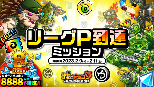 株式会社アソビズム(本社:東京都千代田区、代表取締役:大手智之)は、App Store・Google Playにて好評配信中の『城とドラゴン』で、「リーグ」および「リーグP到達ミッション」を2023年2月9日(木)より開催いたします。