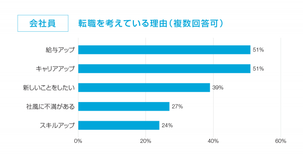 今回の調査結果では、会社員が転職を望む理由として「給与アップのため」、「キャリアアップ」が共に51%でした。また、「新しいことをしたい」(39%)、「社風に不満がある」(27%)等、仕事への不満や創造性・刺激不足から新しい転職の機会を求めている事実がわかりました。