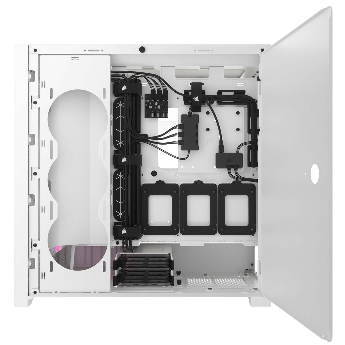 右サイドパネルに最大で120 mmファン3基または360 mmラジエータを搭載でき、エアフローやRGBファンのライティング強化が可能です。各種簡易水冷はもちろん、本格DIY水冷にも柔軟に対応できる拡張性を備えています。
