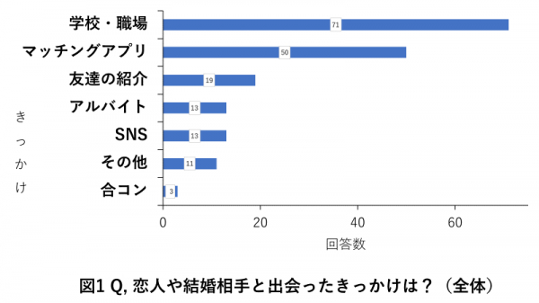 恋人や結婚相手と出会ったきっかけとして、最も多くの割合を占めていたのは「学校・職場」。次いで「マッチングアプリ」の回答数が多くみられました。