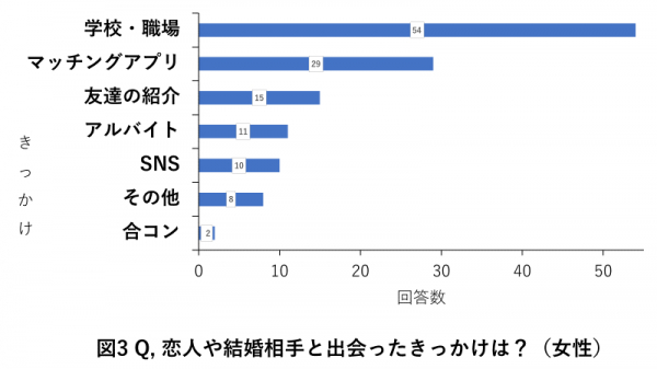 男女で比較すると、男性は出会いのきっかけとして「マッチングアプリ」が多く選択されているのに対し、女性は「学校・職場」を選択している回答者が多いことが分かりました。