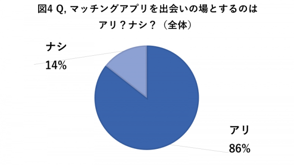 マッチングアプリに対し、出会いの場として「アリ」と回答した方は86%、「ナシ」と回答した方は14%を占めていました。