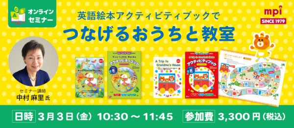 児童英語教育44年の株式会社mpi松香フォニックス(創立:1979年、代表者:竹村千栄子、以下mpi)は、mpiオリジナル英語絵本 アクティビティブックの共著者で、子ども英語指導者コミュニティMELEP(めれっぷ・麻里英語教育ポート)を主宰している中村麻里氏を講師に迎え、幼児から小学生低学年に適した英語絵本アクティビティブックを使ったオンラインセミナーを2023年3月3日(金)に開催いたします。