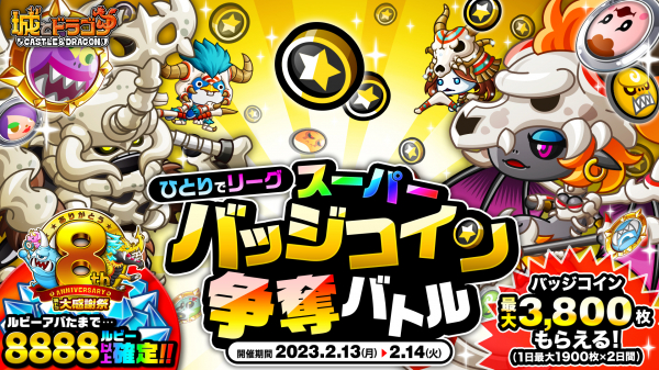 株式会社アソビズム(本社:東京都千代田区、代表取締役:大手智之)は、App Store・Google Playにて好評配信中の『城とドラゴン』で、2023年2月13日(月)より「ひとりでリーグスーパーバッジコイン争奪バトル」を開催いたします。