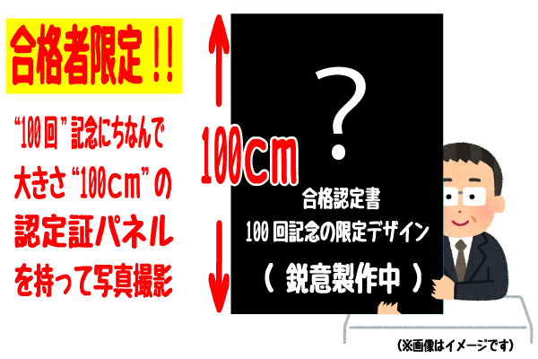 (3)“100回”にちなんで、“100cm”の大きな合格認定証パネルと記念撮影