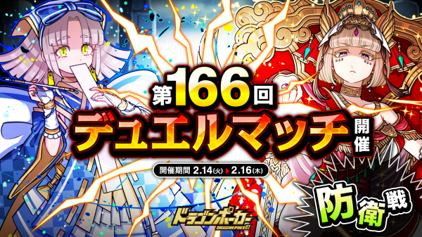 株式会社アソビズム(本社:東京都千代田区、代表取締役:大手智之)は、App Store・Google Playにて好評配信中のリアルタイム合体カードバトル『ドラゴンポーカー』で、2023年2月14日(火)より「第166回デュエルマッチ本戦」を開催いたします。