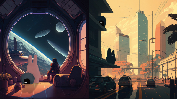展示作品の中にはジェネレーティブAIと連携して制作された作品も公開。背景などをジェネレーティブAIで生成し、イラストレーターがキャラクターを加筆することで完成された作品です。