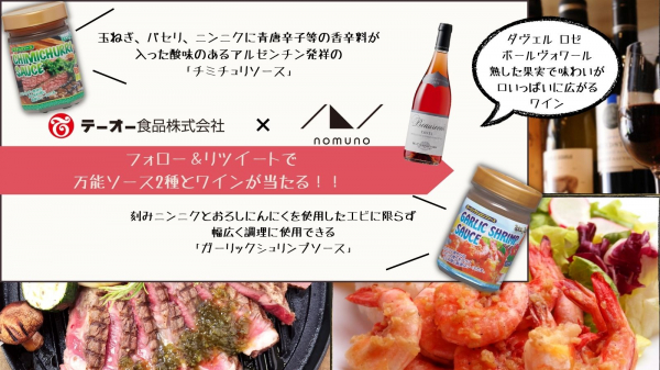 株式会社ノムノ(本社:東京都港区 代表取締役社長:蔵石 周太)が運営するワインバーnomunoとテーオー食品株式会社(本社:東京都豊島区 代表取締役社長:高橋 征一)がTwitterで万能ソースとワインのセットをプレゼントするキャンペーンを開催いたします。