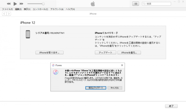 Step 3、パソコンでiTunesのソフトが立ち上がり「復元」と表示されるので選択します。
