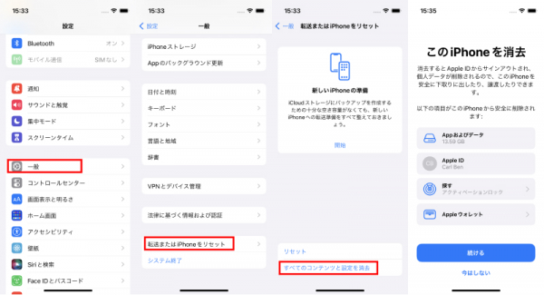やり方:iPhoneの画面の「設定」→「一般」→「転送またはiPhoneをリセット」→「すべてのコンテンツと設定を消去」を選択します。
