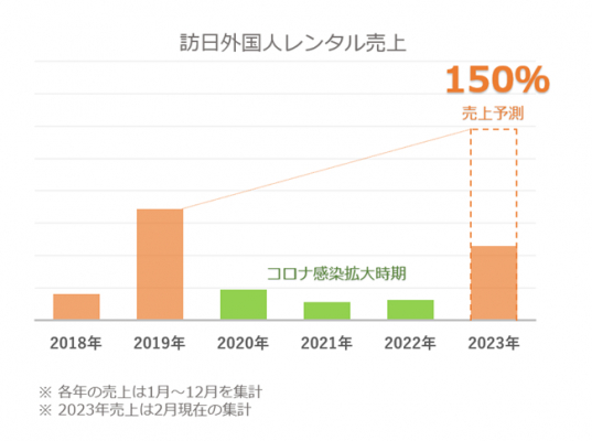 ジャパンキャンピングカーレンタルセンターは、2018年よりインバウンド利用が増え始め、2019年には過去最高の売上となりましたが、2020年1月コロナ流行と共にお問い合わせ減少、予約キャンセルが合い続き売上ダウンとなりました。2022年9月下旬からは、コロナ明けムードで各国から問い合わせがあり予約も入り始め、2023年2月時点で既に過去最高の売上を記録した2019年の売上70% まで達成し、本年の売上予測は過去最高売上の150%となる見込みで本格復活となりました。