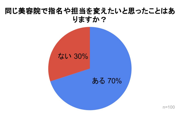 「同じ美容院で指名や担当を変えたいと思ったことはありますか?」の質問では、『ある』が70%、『ない』が30%という結果となり、7割と多くの人が美容師を変えたいと思ったことがあるとわかりました。