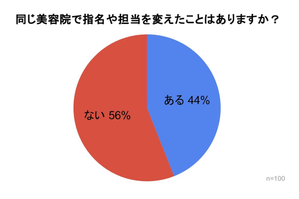 「同じ美容院で指名や担当を変えたことはありますか?」のアンケート調査を行ったところ、44%と半数近くの人が”ある”と回答されました。