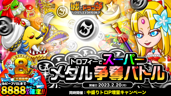 株式会社アソビズム(本社:東京都千代田区、代表取締役:大手智之)は、App Store・Google Playにて好評配信中の『城とドラゴン』で「トロフィーでスーパーメダル争奪バトル」を2023年2月20日(月)より開催いたします。