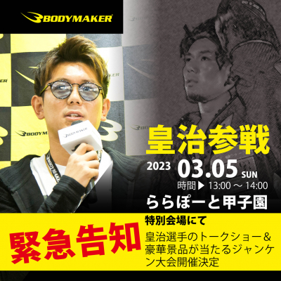 2023年2月23日(祝)「BODYMAKER ららぽーと甲子園店」がオープンします。そのオープニング記念イベントとして、2023年3月5日(日)13時~14時(予定)BODYMAKER ららぽーと甲子園店にBODYMAKER契約アスリートモデルの「RIZINファイター皇治選手が来店!」が決定。来店イベントとして「じゃんけん大会やトークショーなど」盛りだくさんな内容でお待ちしております。また、ファン必見のコラボ商品も販売。ご購入特典としてサイン&握手…など。ぜひご来店ください。