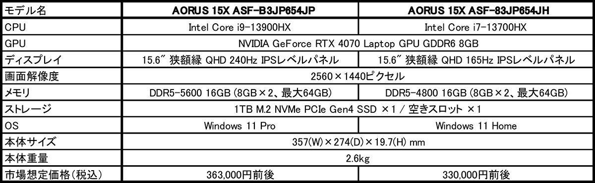 一方、「AORUS 15X ASF-83JP654JH」は、CPUに16コア/24スレッドの第13世代Intel Core i7-13700HX(ベースクロック2.1GHz、Turbo Boost時最大5GHz)、ディスプレイにリフレッシュレート165Hz駆動のQHD液晶パネルを採用した製品です。