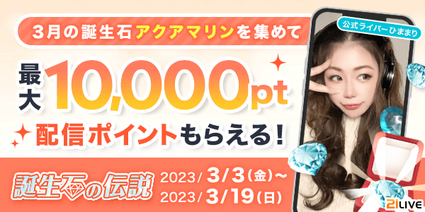 株式会社エムアンドティーティー(本社:沖縄県北谷町、代表取締役:井藤 三知子)が運営するエンターテイメント・ライブ配信アプリ【21LIVE(ニーイチライブ)】URL: https://21.live では、3月3日(金)から3月19日(日)まで誕生石ギフト・アクアマリンの獲得数を競うイベント『誕生石の伝説』を開催いたします。