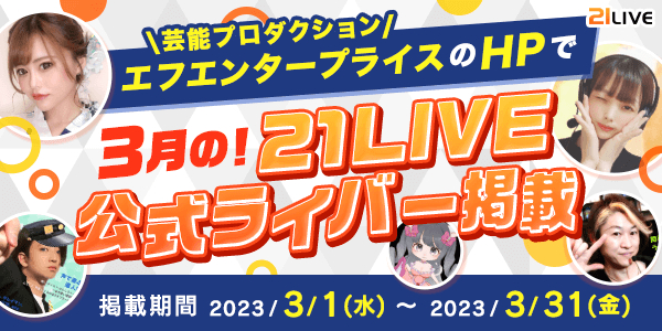 3月1日(水)~3月31日(金)の期間中、21LIVEの公式ライバーが芸能プロダクション・株式会社エフエンタープライズ(F.Enterpris)のホームページに掲載されます!