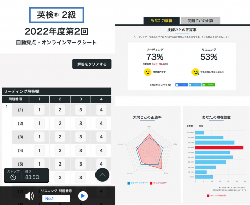 無料の「自動採点サービス」(PC/スマートフォン/タブレット対応)では、問題ごとの正誤だけでなく、技能ごと・大問ごとの正答率も自動で表示されます。