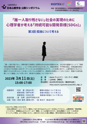 この度、公益社団法人 日本心理学会との共催で3月11日に公開シンポジウム、「誰一人取り残さない」社会の実現のために:心理学者が考える「持続可能な開発目標(SDGs)」第3回「孤独について考える」を開催することを決定しました。