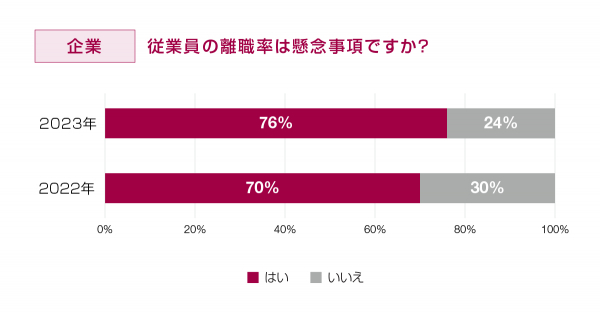 調査によると企業の57%が専門スキル/即戦力人材不足を「非常に懸念している」と回答しました。2022年に行われた同様の調査で、「非常に懸念している」と回答した企業は48%でした。また、「従業員の離職率が懸念事項である」(下図)と回答した企業は、2023年では76%、2022年は70%でした。上記2つのことから、人材不足に拍車がかかっていることが想像できます。