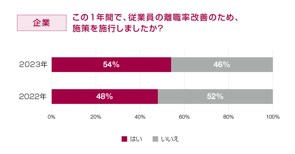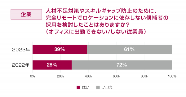 人材不足の打開策として企業側が施策を行っているのかを見ると(下図)、離職率改善のため施策を施行したと回答した企業は54%に昇り、2022年の48%を上回りました。企業も従業員の人材確保に力を入れ始めています。また人材不足対策やスキルギャップ防止のために、昨今注目を集め始めている完全リモートでロケーションに依存しない候補者の採用を検討(下図)している企業は約4割でした。2022年の調査では3割以下だったことから、企業はあらゆる手をつくし、人材確保を図っていることがうかがえます。
