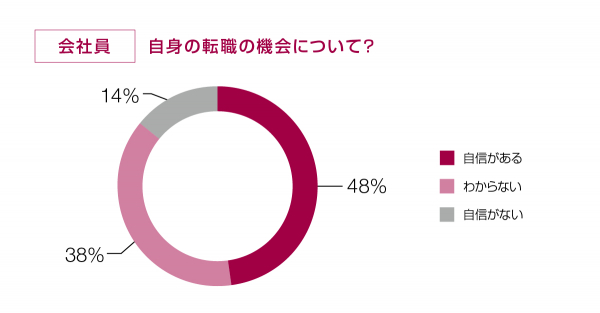 反対に会社員側の動きを見てみると、自身の転職の機会(下図)について「自信がある」と回答したのは約半数(48%)でした。人材不足で会社員側の売り手市場であるといことはこの数字からも読み取ることができます。